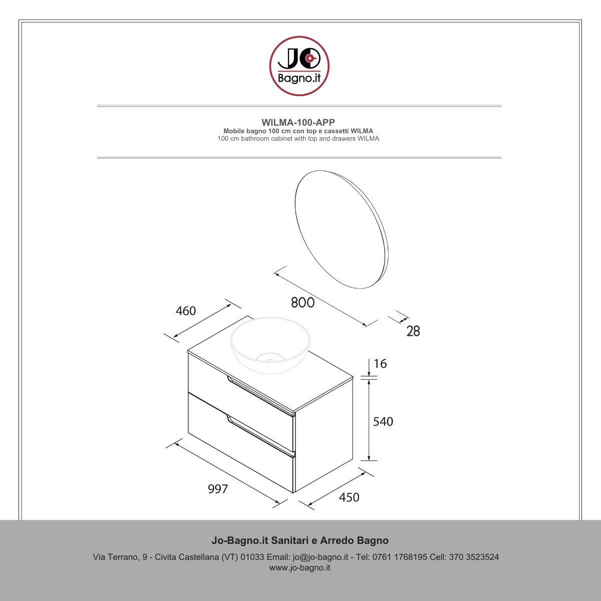 Il modello WILMA 100 cm è ideale per bagni moderni e di piccole dimensioni. La struttura sospesa (99,8 x 45 cm) crea una sensazione di leggerezza visiva e facilita la pulizia del pavimento. La base è progettata per ospitare un lavabo d’appoggio (non incluso), permettendoti di personalizzare il tuo bagno scegliendo la forma e lo stile del lavabo che preferisci tra quelli disponibili su Jo-Bagno.it.