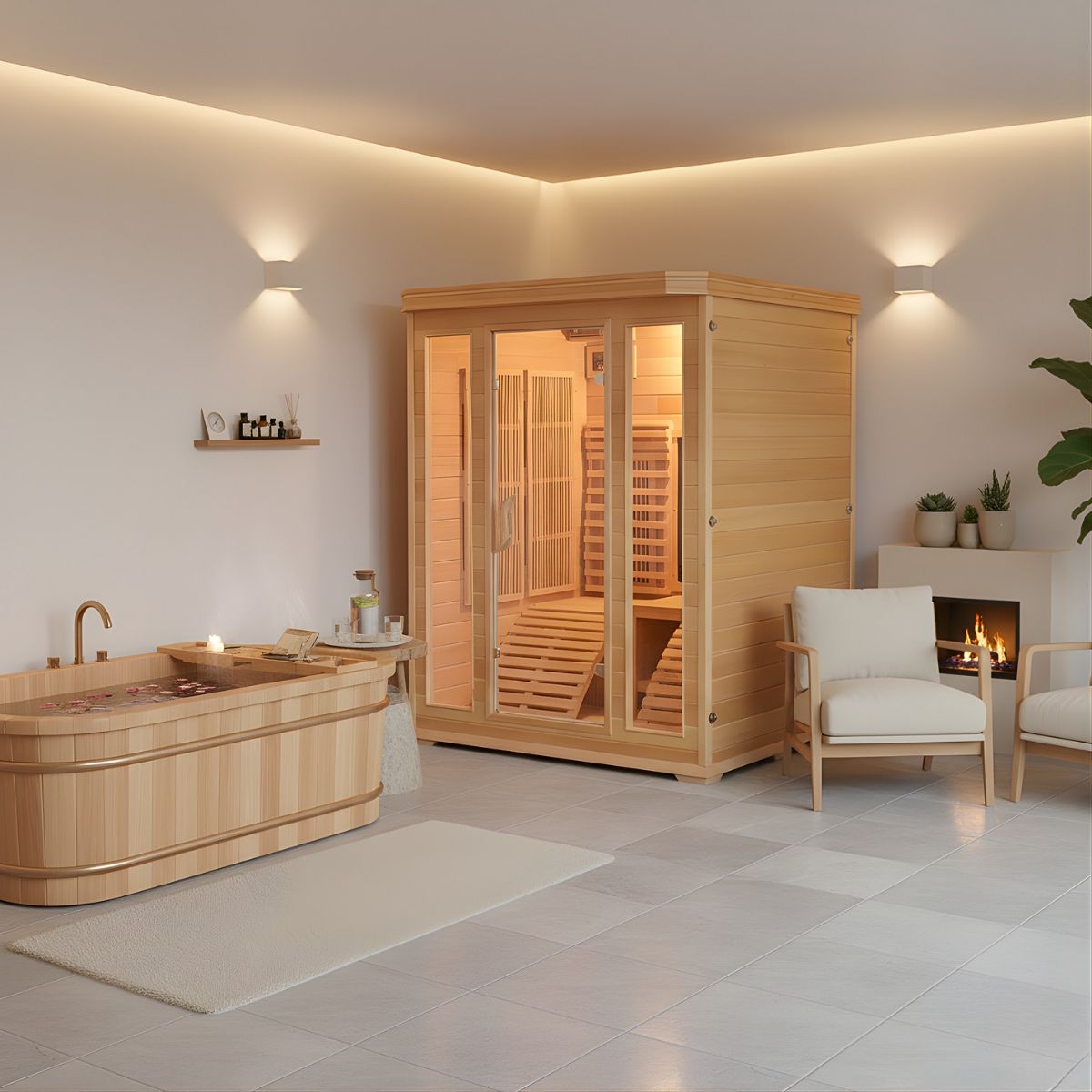 Questa tipologia di sauna dona benessere anche alla vista ed all'olfatto grazie alla cromoterapia a 7 colori ed allo ionizzatore per profumoterapia.