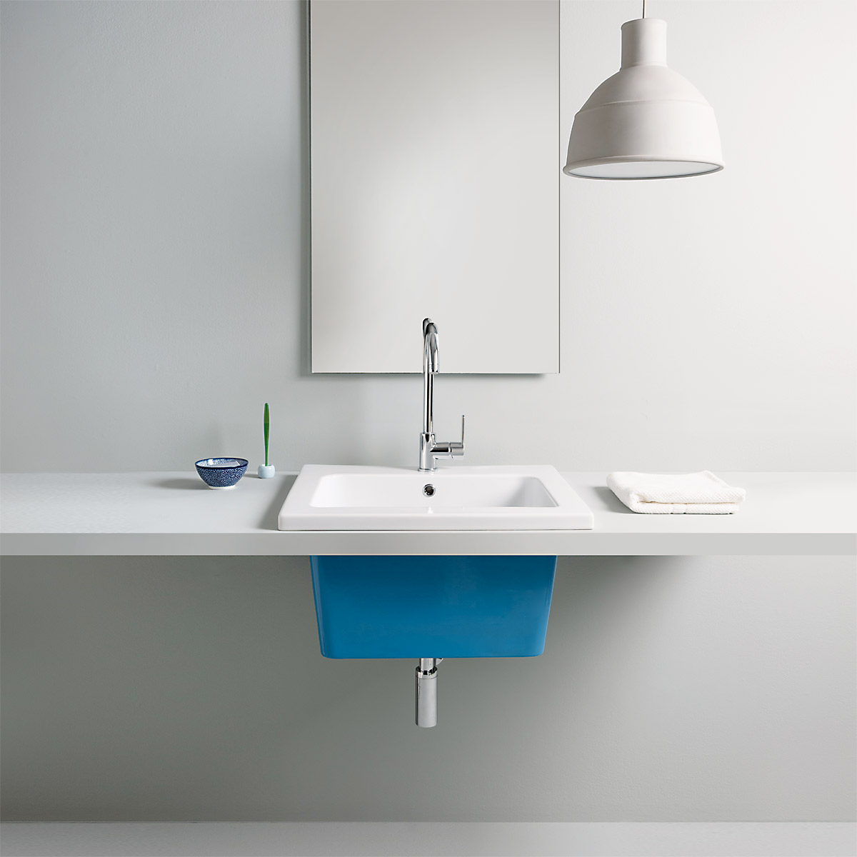 La versione sospesa del lavatoio YORK conferisce all’ambiente un aspetto moderno e ordinato: il bacino sembra fluttuare sulla parete, liberando spazio a terra e aggiungendo profondità visiva. Il contrasto tra l’interno bianco e l’esterno Blu rende il modello bicolore un vero punto focale all’interno del bagno o della lavanderia.