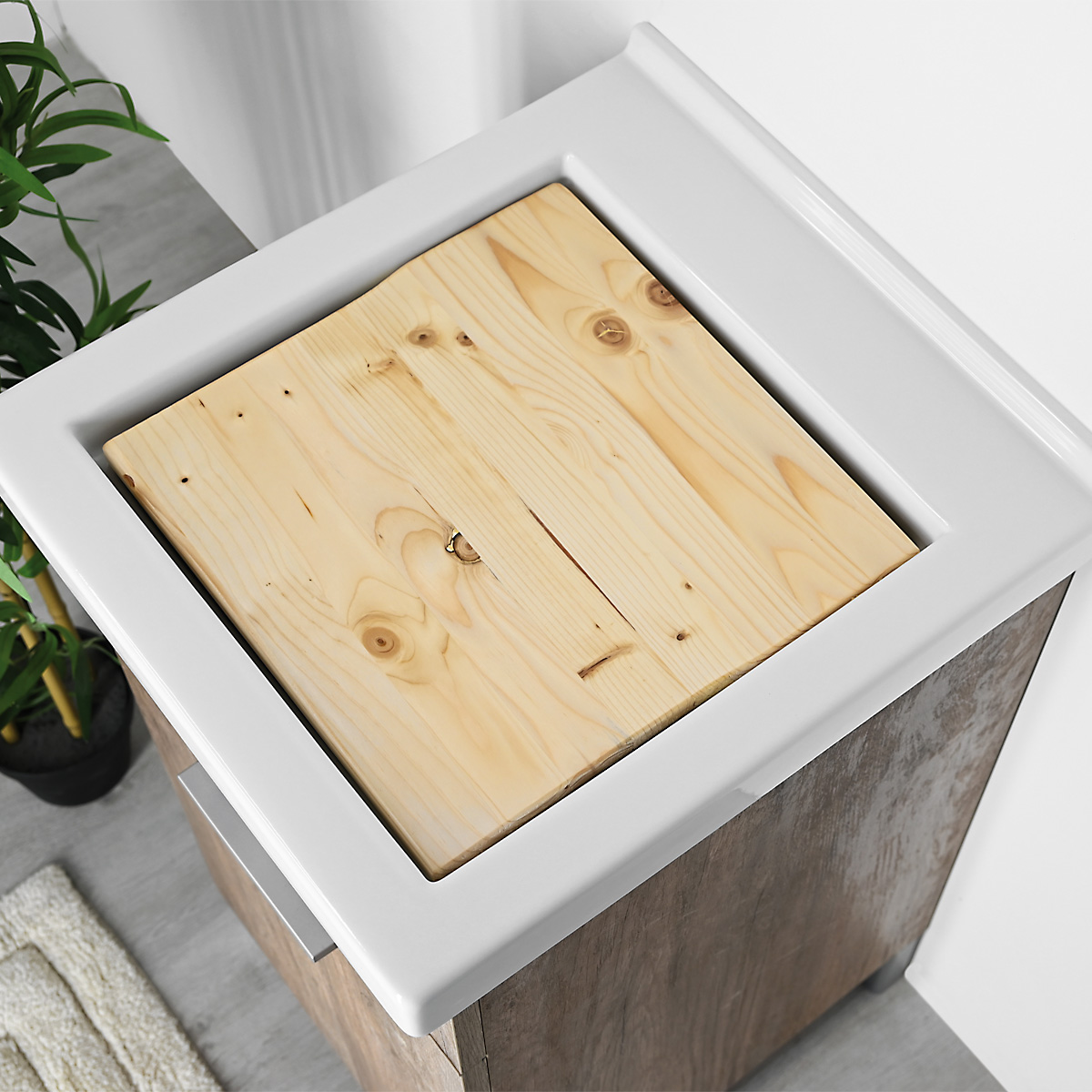 Il lavatoio in ceramica, profondo ben 33 cm, potrà essere corredato da una comoda asse lavapanni in legno, assicurando il massimo comfort durante il lavaggio della biancheria.