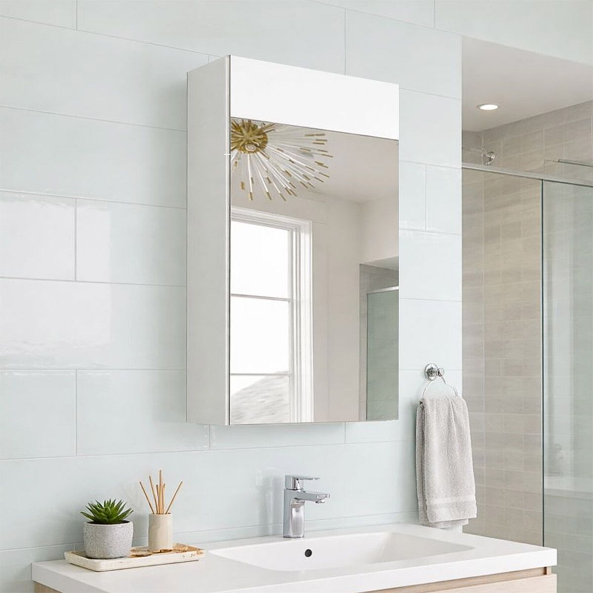 Il modello JCUB50 è uno specchio contenitore bagno compatto e funzionale, perfetto per bagni di piccole e medie dimensioni. Con la sua anta a specchio reversibile (apertura destra o sinistra) e i due ripiani interni in vetro, offre tutto lo spazio necessario per mantenere in ordine prodotti e accessori quotidiani.