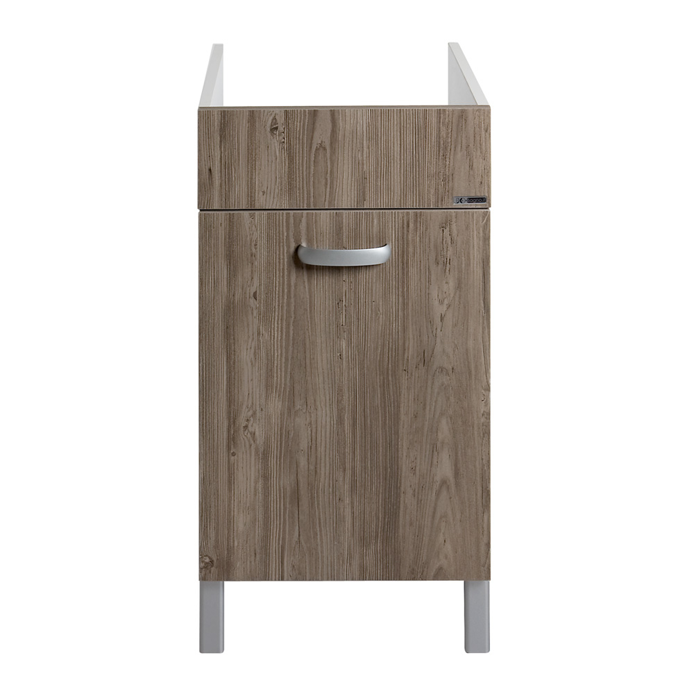 Per la produzione del mobile per lavatoio Domina 45x50 sono stati scelti pannelli di Nobilitato da 1,8 cm in carta melaminica con scocca Bianco Cera rendendolo al tatto forte e robusto nel suo utilizzo e frontale Wood Scuro.